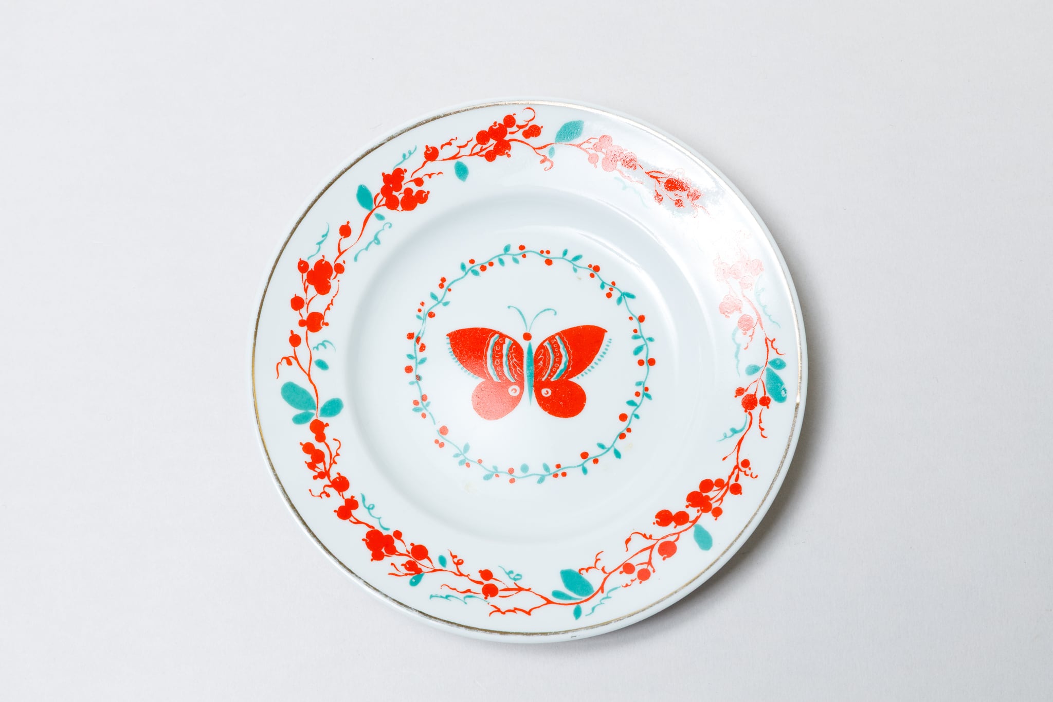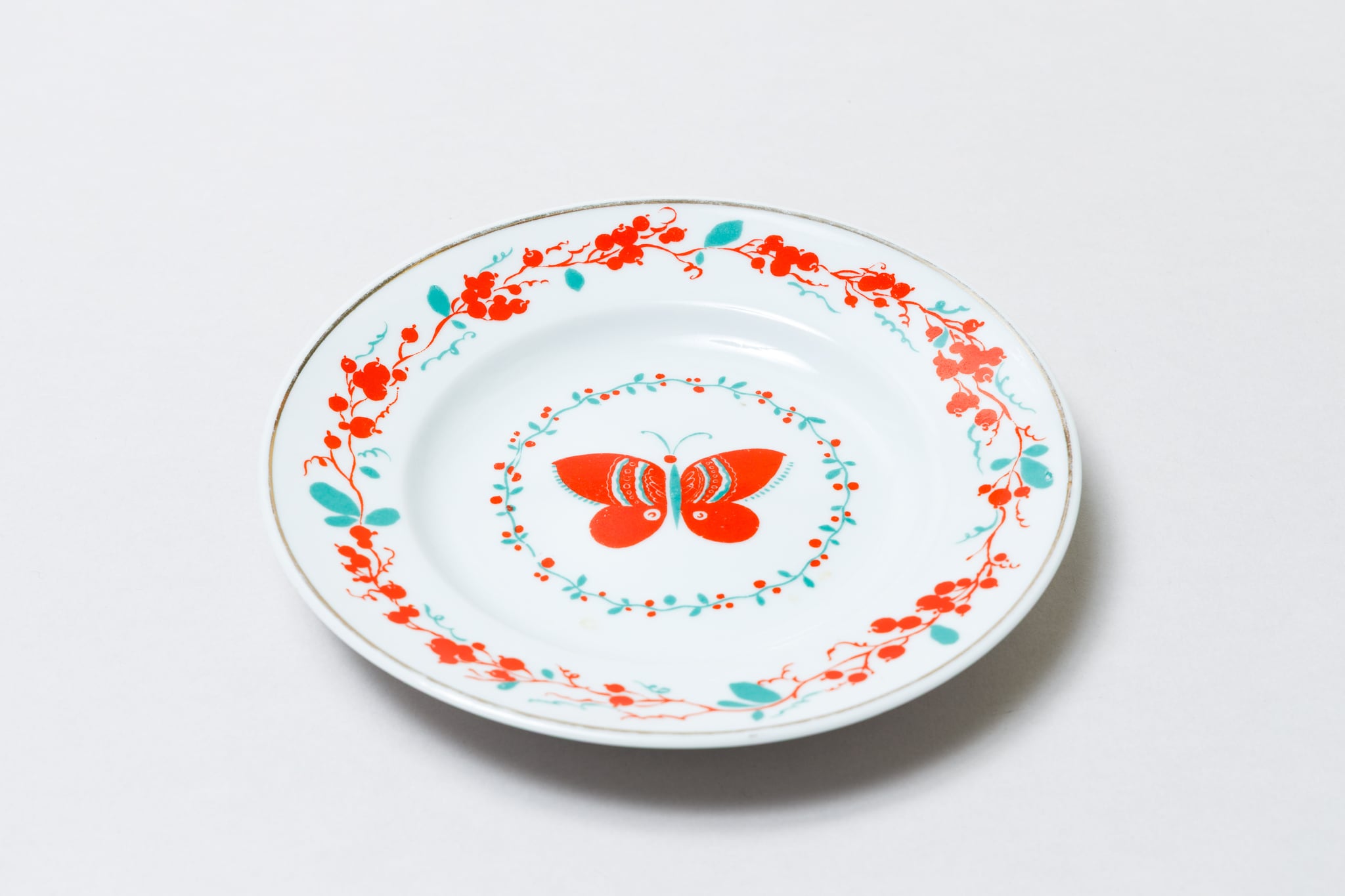 希少なソ連時代のロモノーソフ、ヴィンテージのお皿です。真ん中に赤の蝶々が描かれていて、プレート縁には蝶と同じ色の赤い実と緑の葉っぱが描かれています。とても印象的な一枚です。
